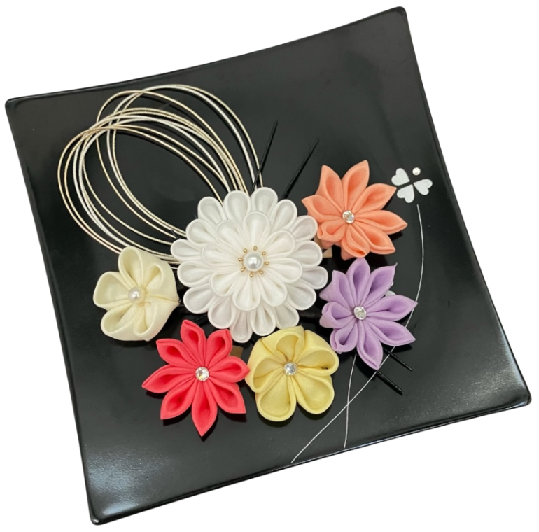 正絹の髪飾りはお色次第でドレスにも合います。そのまま謝恩会につけていくのもおすすめです。